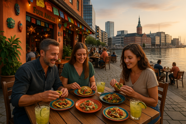 Midt i dette kulinariske landskab finder vi Four Amigos, der skiller sig ud med deres autentiske mexicanske retter. Her kan du opleve en smagsrejse gennem Mexicos kulinariske traditioner med retter som tacos, ceviche og farverige margaritas. Four Amigos tilbyder en unik atmosfære, hvor du kan nyde en afslappet middag i selskab med venner og familie. Deres fokus på autentiske smagsoplevelser gør dem til et must-visit for dem, der ønsker at opleve noget anderledes ved Aarhus havn.